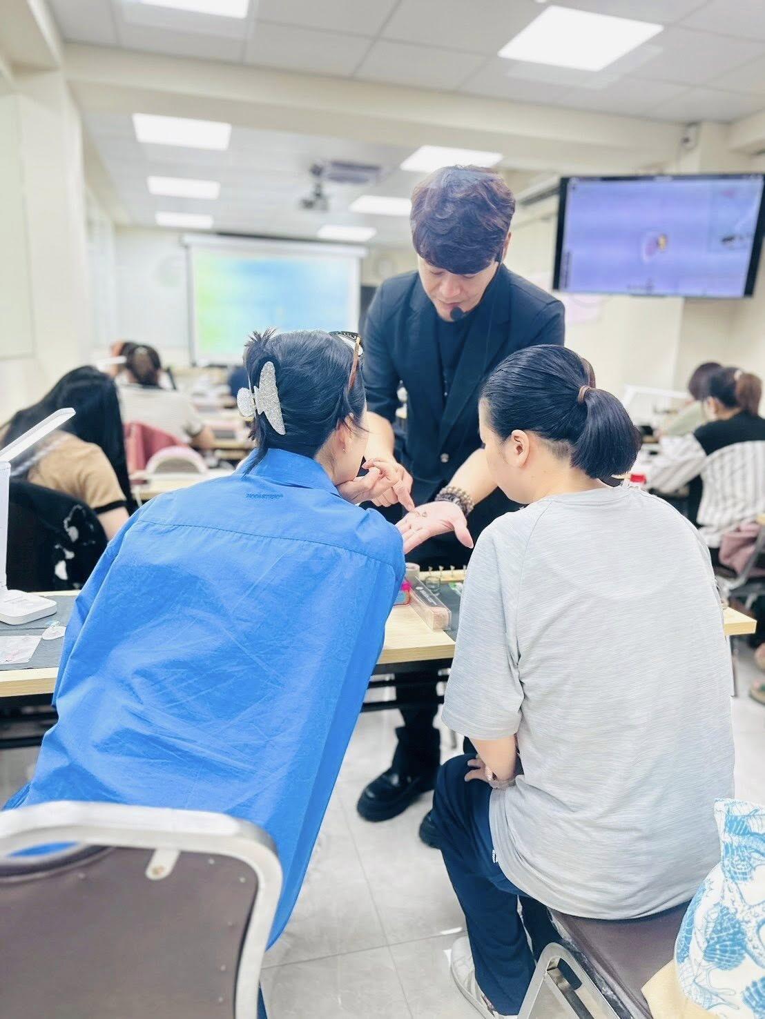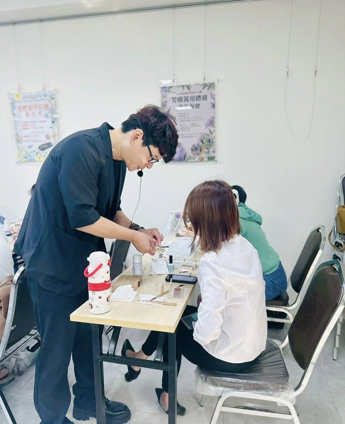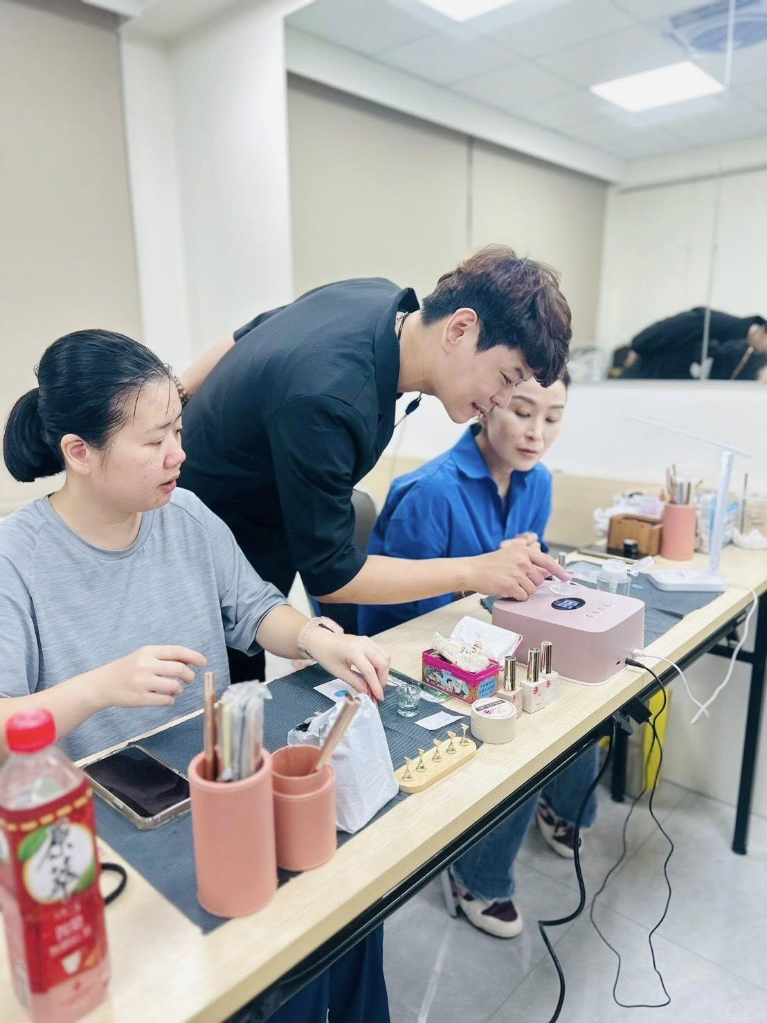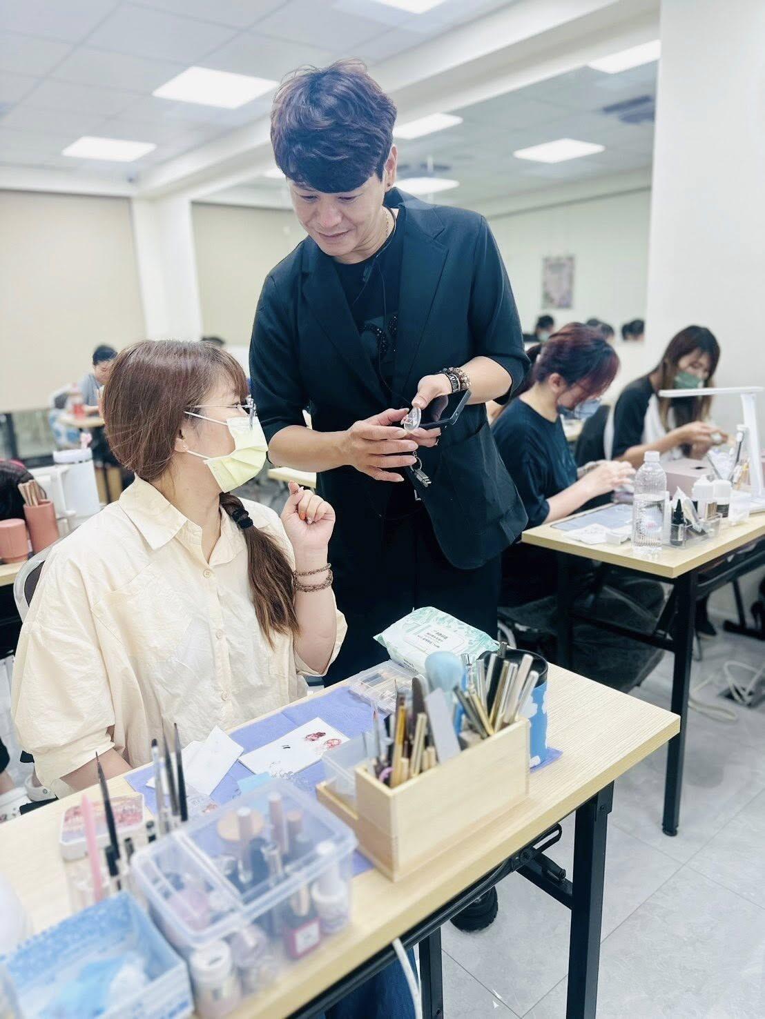 老師非常專業,也主動與學員們良性雙向溝通奔赴,互動非常的和樂,老師負責任的態度就是感動,今天學員們的笑容看得出來非常喜歡老師的教法,分享教學美甲作品也是學員的作業喔